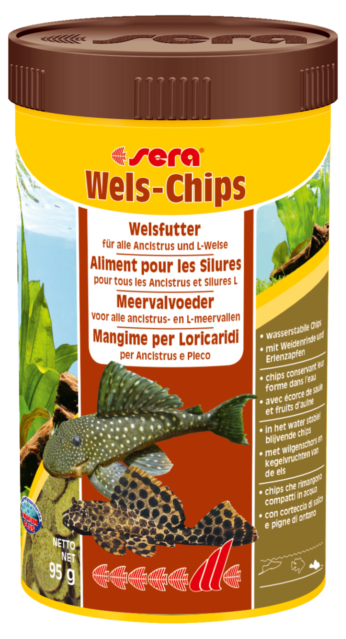 sera Wels-Chips ist das Hauptfutter aus schonend hergestellten Chips für raspelnde und saugende Bodenfische wie Ancistrus und L-Welse.